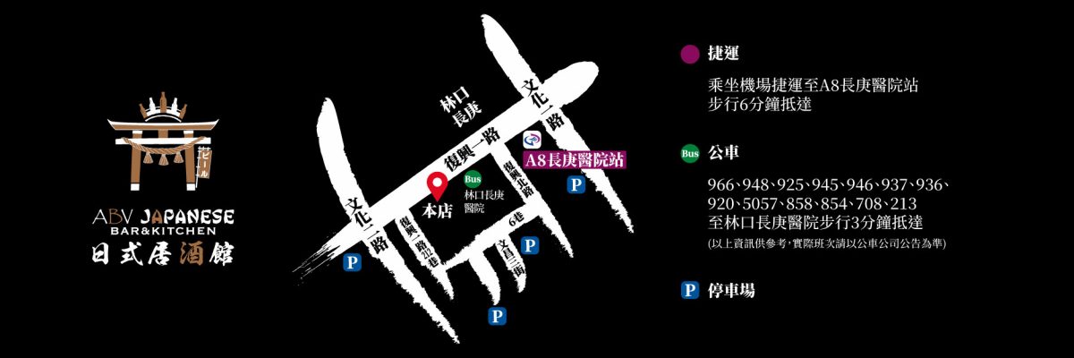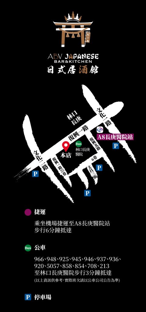 聯絡電話1:03-397-9560聯絡電話2:03-397-9575地址:桃園市龜山區復興一路130之1號週一~週日 中午12:00~凌晨3:00FB粉絲頁:ABV 日式居酒館 林口長庚店