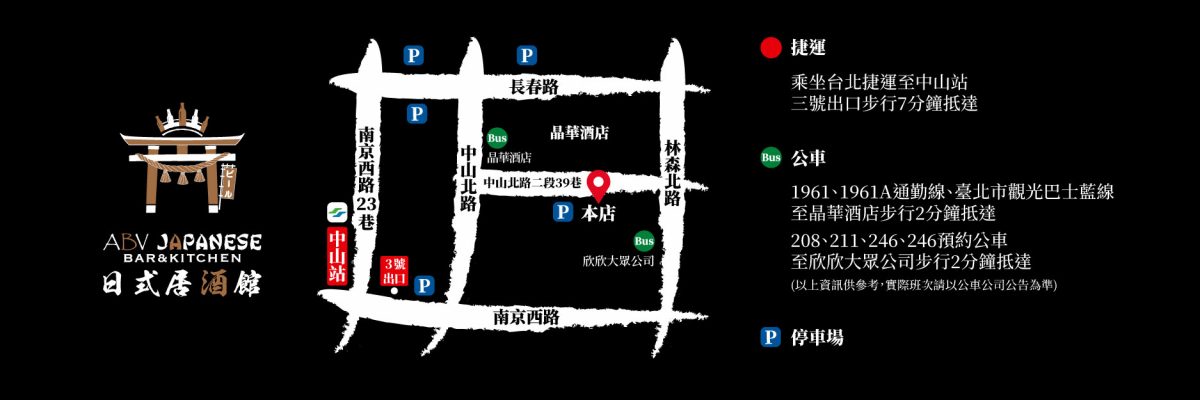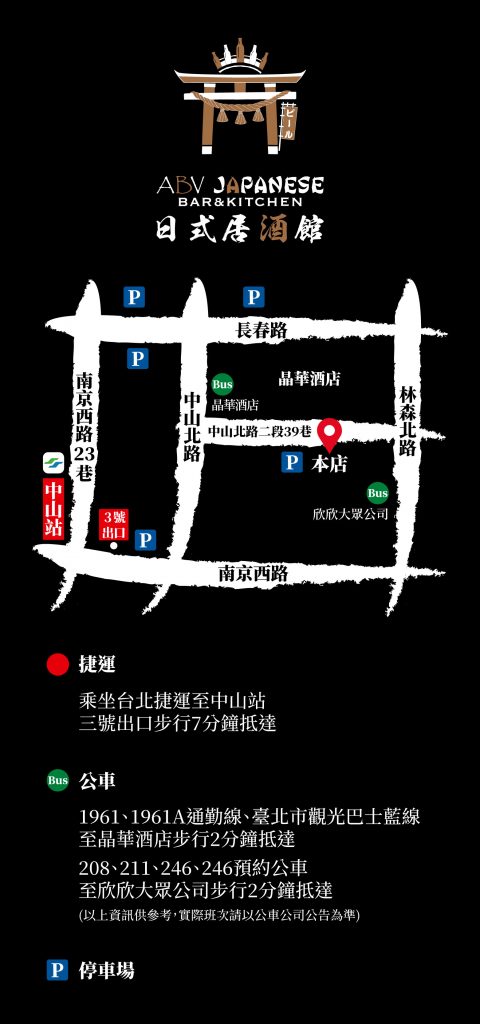 聯絡電話1:02-2571-1007聯絡電話2:02-2571-1008地址:台北市中山北路二段39巷16-2號週一~週日下午4:00~凌晨2:00捷運站:中山捷運站3號出口FB粉絲頁:ABV 日式居酒館