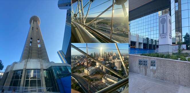 Reunion Tower(重逢塔) 是美國德州 達拉斯市中心 最具代表性的地標之一,自 1978 年 落成以來成為城市天際線的象徵。塔高約 171 公尺(561 英尺),頂部的圓球外層由 259 個 LED 燈組成,夜晚會隨節日與活動展示精彩燈光秀。訪客可搭高速電梯直達 GeO-Deck 觀景台,從約 470 英尺 的高度享受 360° 全景視野,無論白天俯瞰城市景觀或夜晚欣賞燈火闌珊,都極具魅力,是觀光、約會與拍照打卡的熱門景點。觀景台還配有互動展覽與望遠鏡,讓你更深入認識達拉斯。