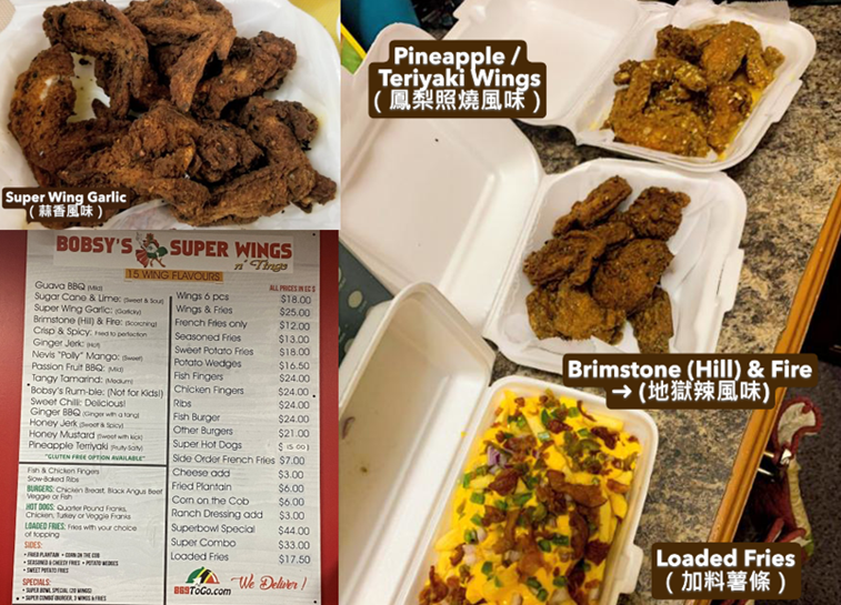 必吃料理: 超級雞翅(Super Wings) — 多達十幾種口味可選,如Brimstone、Ginger Jerk、Passionfruit、Pineapple Teriyaki 等,醬料香氣獨特且肉汁豐富