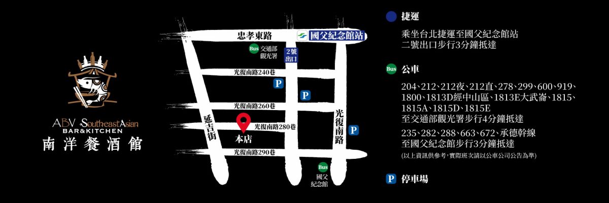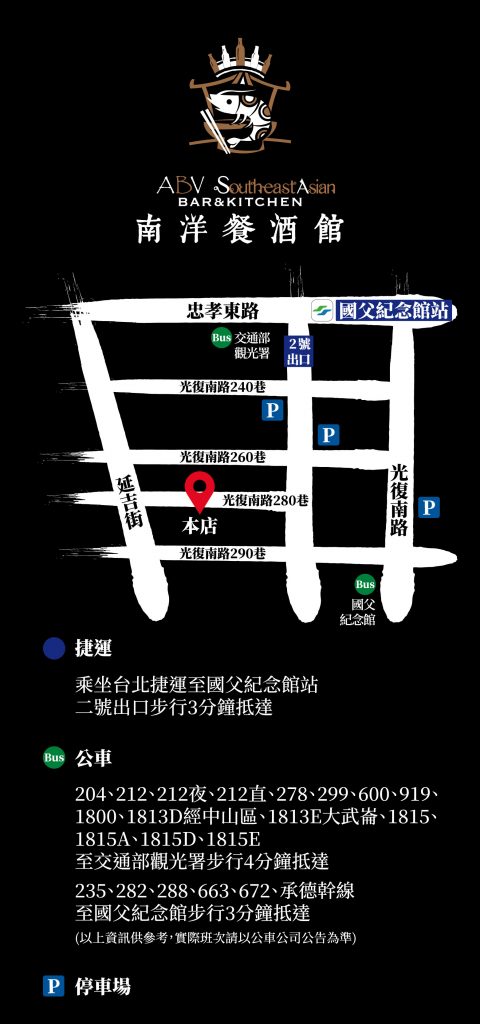 聯絡電話1:02-2721-0760聯絡電話2:02-2721-0750地址:台北市大安區光復南路280巷39號週一~週日 中午12:00~凌晨1:30捷運站:國父紀念館捷運站2號出口FB粉絲頁:ABV 南洋餐酒館